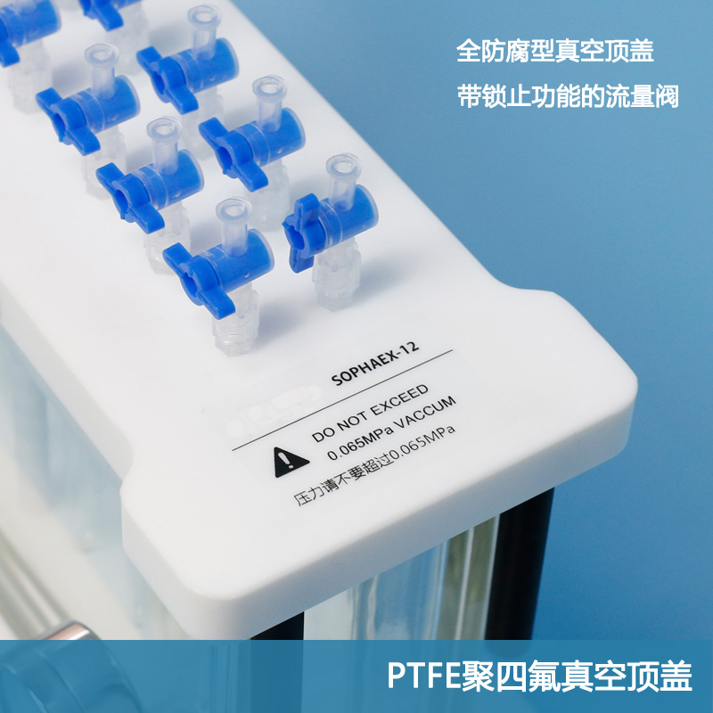 Sophaex 12 附帶的收集架,可同時(shí)進(jìn)行12個(gè)SPE萃取操作,裝置配備的真空玻璃缸,可以讓使用者對(duì)收集樣品過(guò)程一目了然,Sophaex 12 頂蓋、底座及試管收集架全部采用防腐材料,耐強(qiáng)酸強(qiáng)堿,經(jīng)久耐用。裝置配置真空表及調(diào)壓閥組建,可進(jìn)行簡(jiǎn)單調(diào)節(jié)真空度。