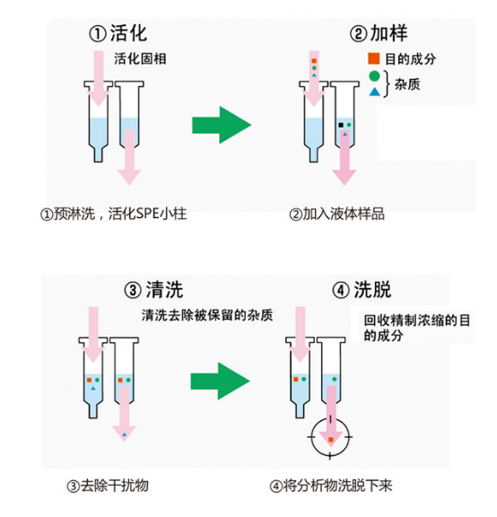 固相萃取(簡(jiǎn)稱SPE),是一種包括液相和固相的物理萃取過(guò)程,被廣泛應(yīng)用并且備受歡迎的樣品前處理技術(shù)。它是通過(guò)填料的鍵合功能團(tuán)和待分離化合物之間的作用力,將目標(biāo)化合物與樣品基質(zhì)分離,然后再用洗脫液洗脫或加熱解吸附來(lái)達(dá)到分離和富集目標(biāo)化合物的目的。