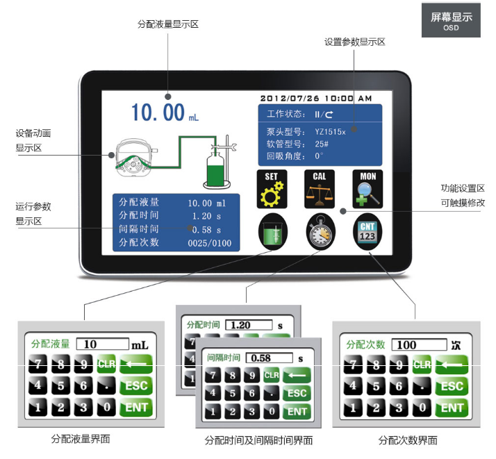 自動(dòng)分液器/連續(xù)分液器/智能分配型蠕動(dòng)泵,智能分配型工業(yè)蠕動(dòng)泵,采用ABS工程塑料外殼,加噴UV涂層,實(shí)現(xiàn)防腐蝕,防靜電保護(hù)。流線型機(jī)身設(shè)計(jì),工業(yè)級(jí)4.3英寸真彩色顯示,觸摸屏操作,轉(zhuǎn)速范圍1-600轉(zhuǎn)/分鐘,流量范圍0.00166-2280ml/min,可預(yù)設(shè)分配流量,分配時(shí)間,間隔時(shí)間,分配次數(shù),回吸角度,動(dòng)畫顯示工作狀態(tài),分配數(shù)據(jù),設(shè)定參數(shù),系統(tǒng)配置同屏顯示??蛇B接腳踏開關(guān)或開關(guān)信號(hào),實(shí)現(xiàn)遠(yuǎn)程控制,適用于大流量、高效率、高精度灌裝。