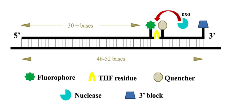 2. THF 位點(diǎn)的上游的 T 堿基上標(biāo)記一個(gè)熒光基團(tuán)(如 FAM),下游在 T 堿基上標(biāo)記一個(gè)淬滅基團(tuán)(如BHQ1),兩個(gè)基團(tuán)的間距為 2-4 nt;