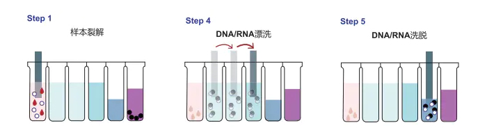 樣品裂解后,釋放出來(lái)的核酸分子被特異性的吸附在磁珠表面,通過內(nèi)置磁棒磁吸、轉(zhuǎn)移、洗滌,zui后使核酸分子溶解在洗脫液中,搭配不同種類的磁珠核酸試劑,zui終得到更純的核酸。