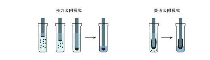 通過全新設(shè)計(jì)的強(qiáng)力吸附模式,磁珠吸附于磁棒頭部部分,從而保證洗脫體積很小的情況下,洗脫液依舊能夠覆蓋全部磁珠,磁珠吸附效果更好,核酸得率更高。
